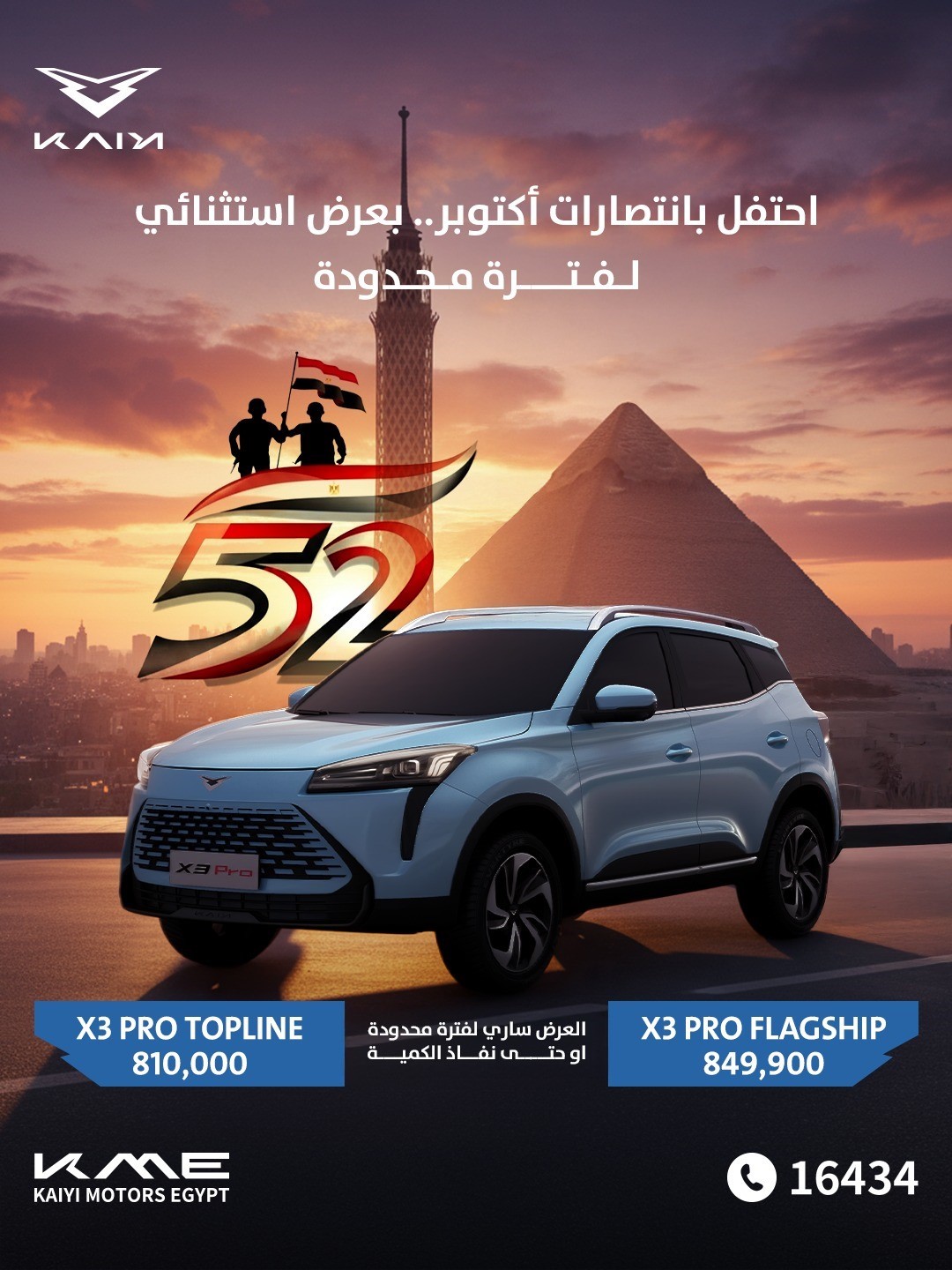 أعلنت شركة كايي موتور إيجيبت، الوكيل الحصري لعلامة كايي أوتو الصينية بالسوق المصري، عن تخفيضات على سيارتها X3 Pro والتي كانت قد أطلقتها خلال شهر مايو من هذا العام 2025 لتكون بذلك أول التخفيضات التي تشهدها منذ تدشينها.اضافة اعلان